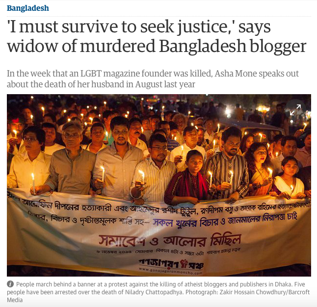 Och det är nu i Bangladesh som fritänkare likt Ananta Bijoy Das och Avijit Roy slaktas av Awlakis lärjungar. Dessa skribenters enda brott var att de gett sig in på livsviktiga diskussioner om religion och blottlagt ett system med religiöst förtryck. Sedan februari 2012 har minst tio intellektuella och aktivister mördats av denna grupp. De har alla blivit hackade till döds av unga män som svingat sina machete: medlemmar i Ansarullah Bangla Team/Ansar al Islam.