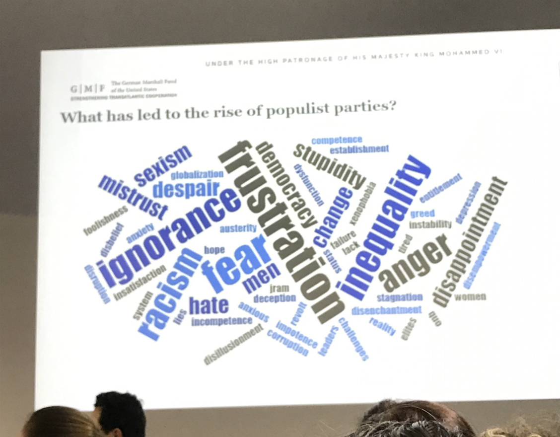 Från publiken ställs en sista fråga om vad denna populism bottnar i. Ännu ett ordmoln skapas när ett par hundra människor klickar fram sina svar. På storbildsskärmen dyker det upp ord som vrede, frustration, ojämlikhet och orättvisa. Det ger en insikt om vad som drivit fram intoleransen och tillbakagångarna under 2016.