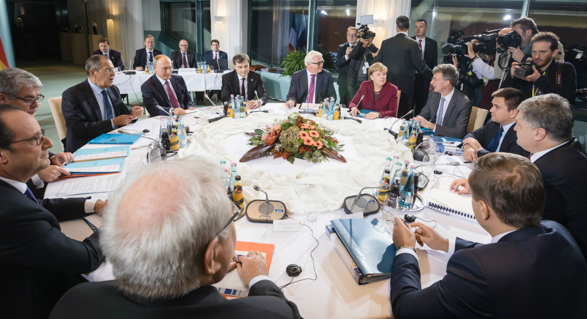 Bänkade i Berlin hos förbundskansler Angela Merkel den 19 oktober. Runt bordet bland andra Rysslands president Vladimir Putin, Frankrikes François Hollande och Ukrainas president Petro Porosjenko. Foto: Drop of Light/Shutterstock.
