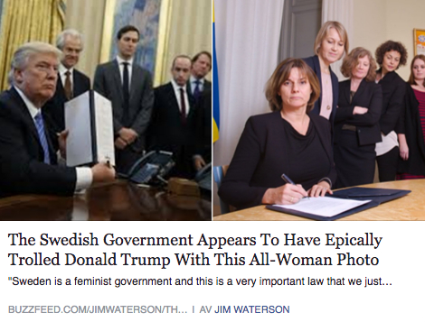 Ur svensk synvinkel var det inte särskilt uppseendeväckande eftersom svenska politiker i årtionden har tävlat om att vara feminister, särskilt under valkampanjerna inför riksdagsvalen. Redan 2000 deklarerade den dåvarande svenske statsministern Göran Persson att han var feminist. Sveriges regering tog ytterligare ett steg då Stefan Löfven hösten 2014 deklarerade att den svenska regeringen var ”En feministisk regering”. Samtidigt meddelade utrikesminister Margot Wallström att Sverige dessutom skulle föra en feministisk utrikespolitik.