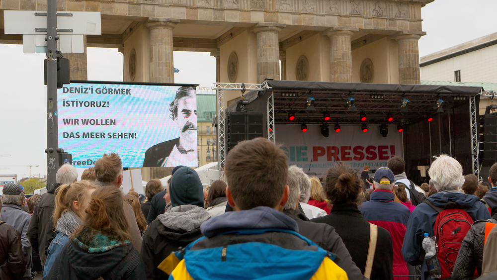 Manifestation vid Brandenburger Tor i Berlin på pressfrihetens dag för Deniz Yücel. Det turkiska slagordet är en lek med ord. "Deniz'i görmek istiyoruz" kan översättas både med "Vi vill se Deniz" och "Vi vill se havet". Foto: Rdw/Shutterstock